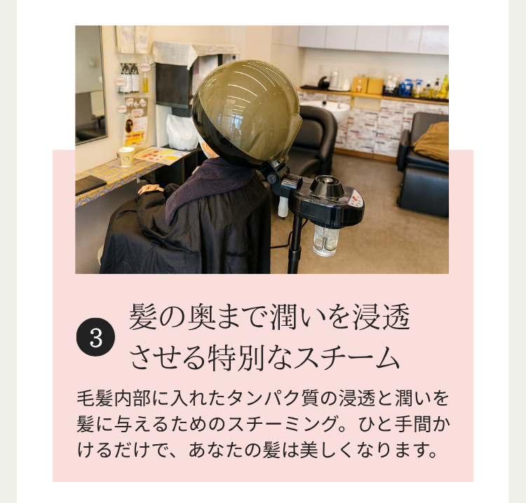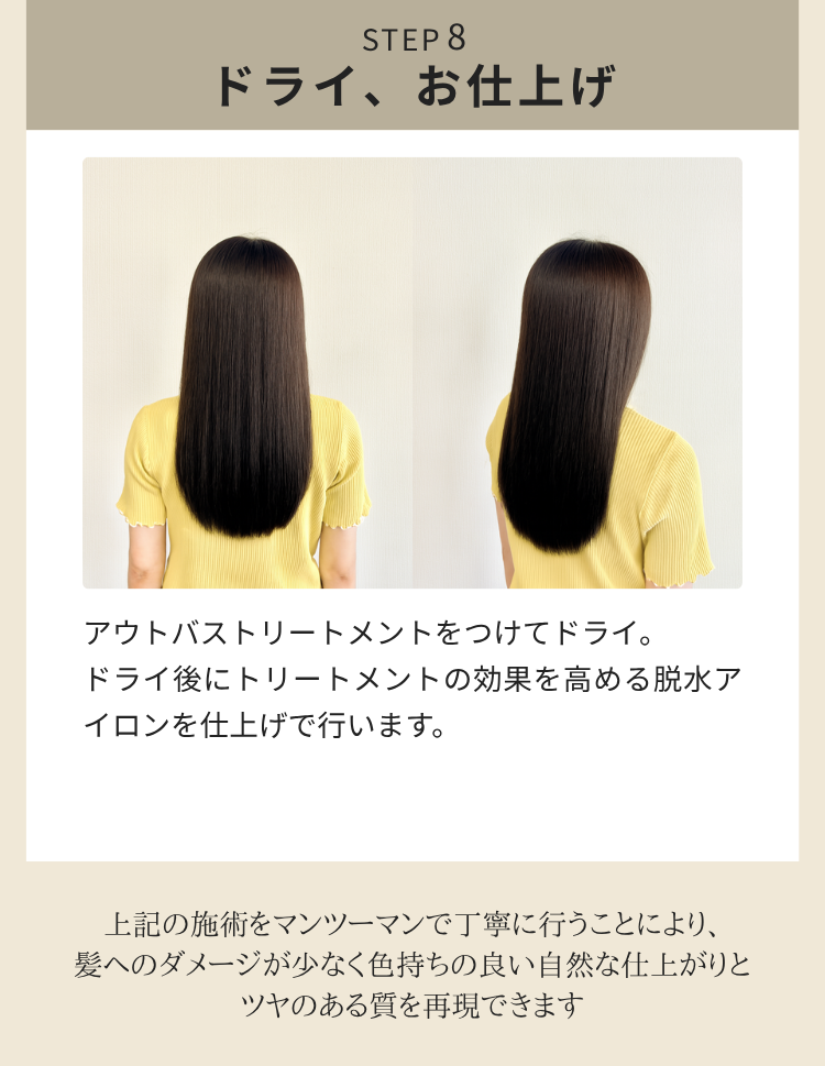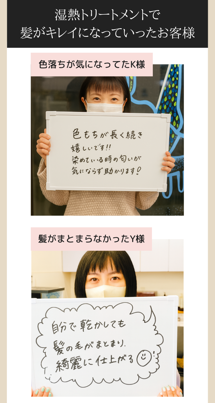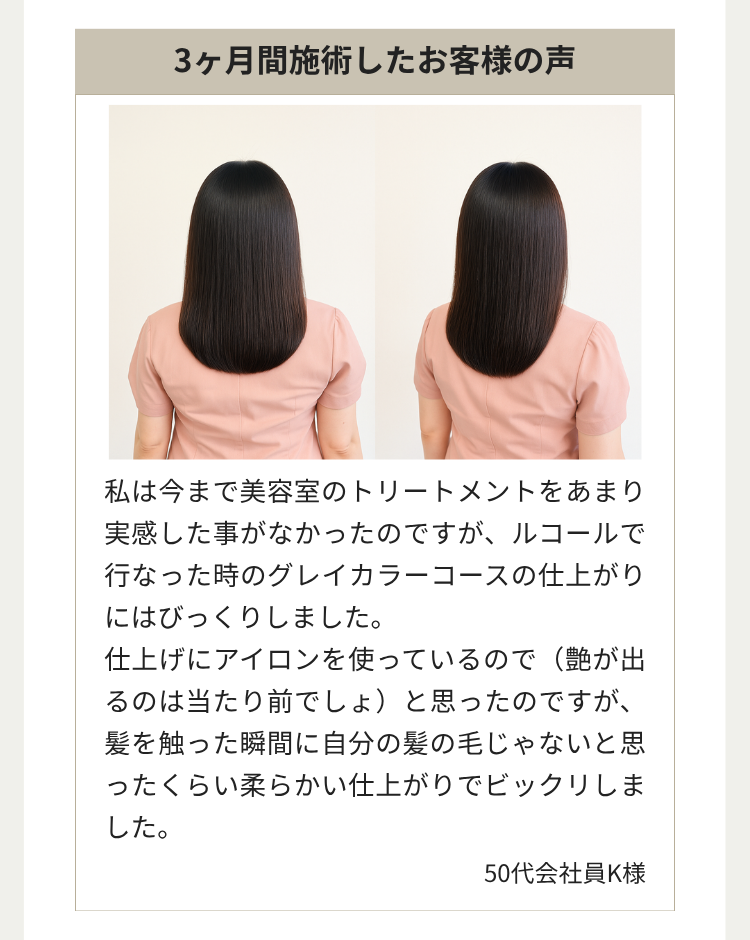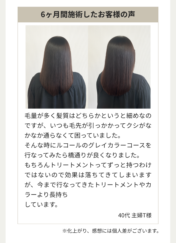 1回の施術でもご来店していただいた時よりも髪の状態は改善されます。しかし、どうしても施術の効果は時間が経つにつれて軽減してしまいますので、まずは40日以内のご来店×3回の集中ケアを推奨させていただいております。