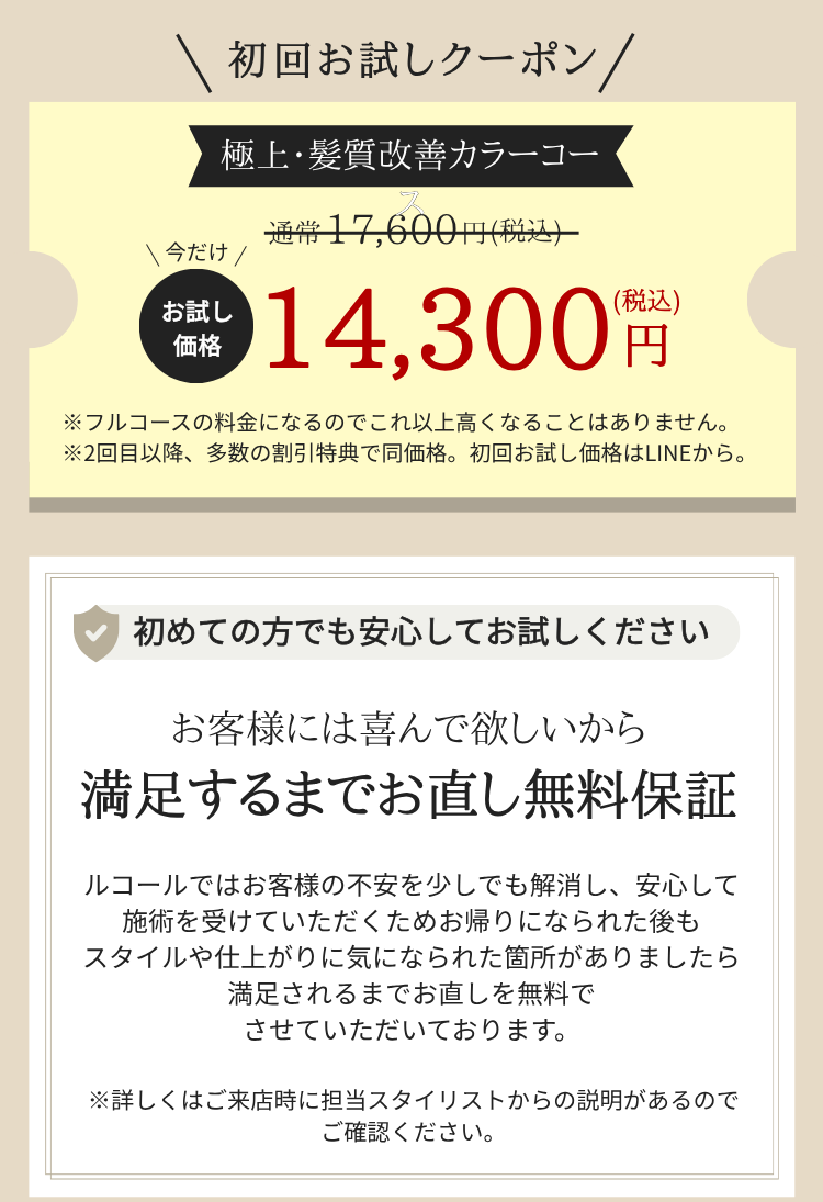 ヘアケアのみのご案内も可能です。また、カラー無しでのカット、ヘアケアのメンテナンスコースもありますので、1度ラインからご相談ください。